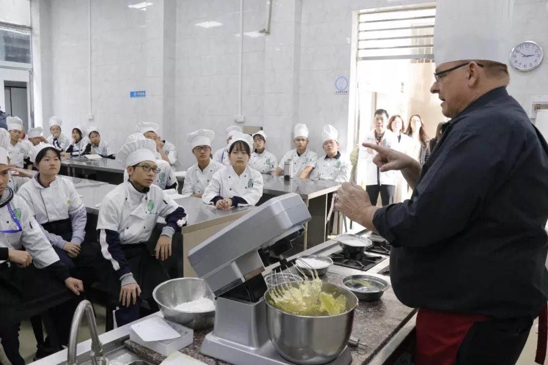 參觀過程中,來賓們對我校中餐烹調(diào)及面點制作課堂表現(xiàn)出強烈的興趣,Mr.Stuart表示,這樣的課堂氛圍非常好,學(xué)生以小組為單位,大家相互協(xié)作,凝結(jié)智慧,制作出的作品都是獨一無二的。
